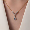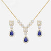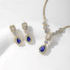 A dazzling necklace set adorned with deep blue teardrop-shaped sapphire and sparkling white crystals. Crafted in 925 sterling silver and finished with radiant 18K gold plating. The intricate detailing and contrast enhance its luxurious elegance. Perfect for evening soirées, festive celebrations, or bridal charm.